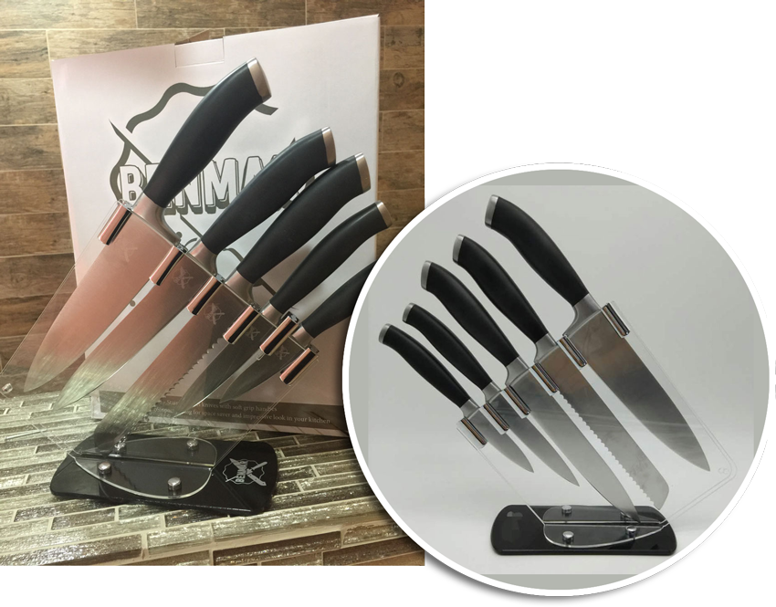 Dale un estilo moderno y elegante a tu cocina con este set de cuchillos en acero inoxidable con un baño en titanio. Fáciles de limpiar y su base en acrílico te permitirá que no se guarden residuos dentro del mismo, permitiendo que los cuchillos siempre se mantengan limpios